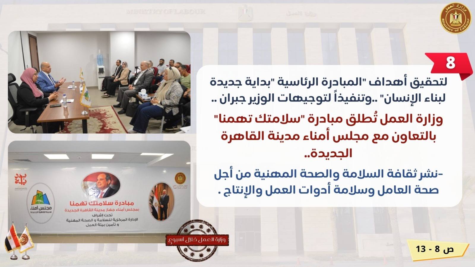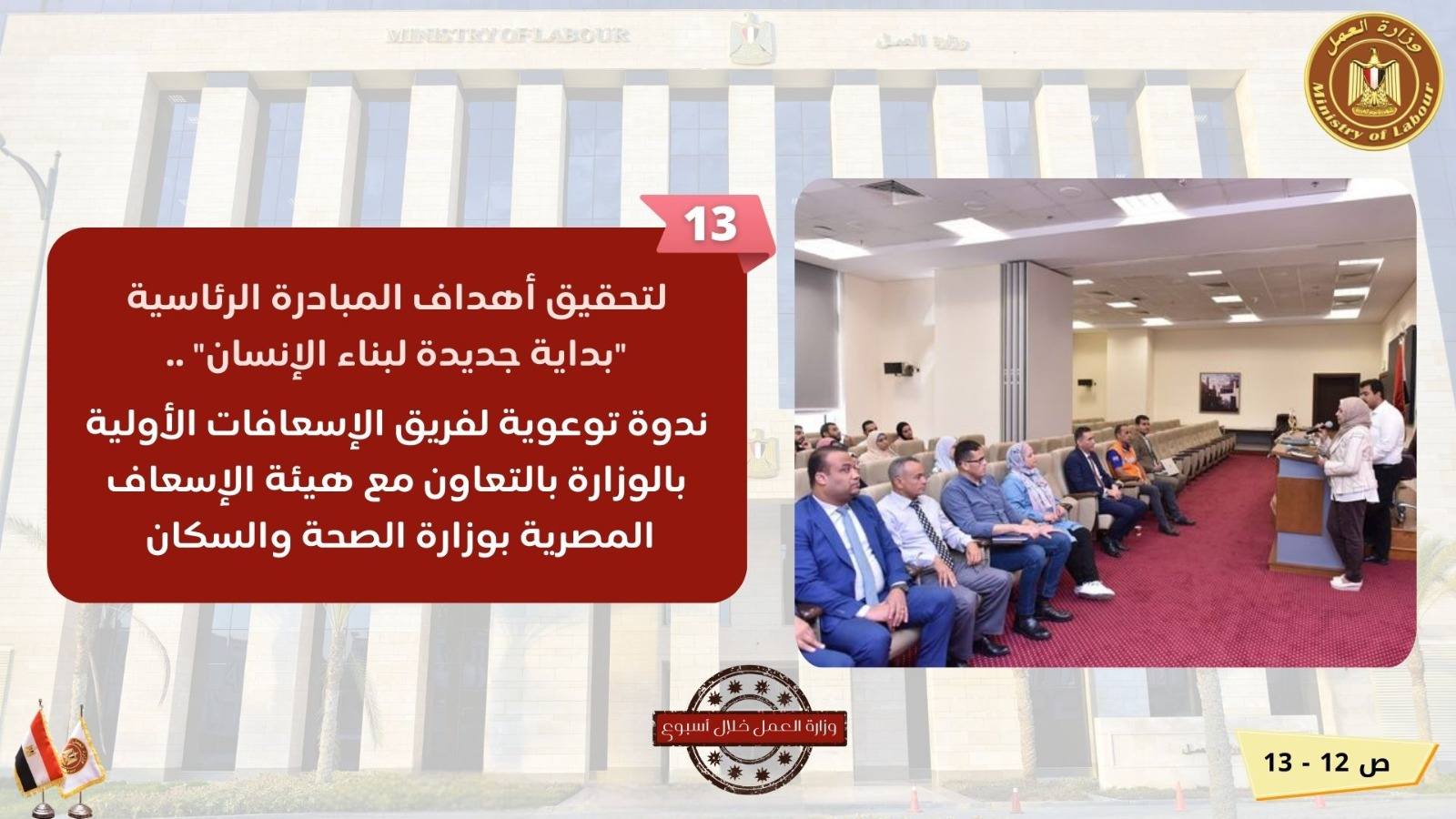 ووجه وزير العمل ،الإدارة العامة لرعاية العمالة غير المنتظمة،ومديرية العمل بالقاهرة ،بسرعة المتابعة، واتخاذ الإجراءات اللازمة بشأن اثنين من العمال ضحايا حادث، داخل مول تحت الانشاء، بالتجمع الخامس ..و أعلنت وزارة العمل ، عن تنظيم فعاليات ندوة توعوية عن "الإسعافات الأولية" ضمن فعاليات المبادرة الرئاسية بداية جديدة لبناء الإنسان ، نظمتها الإدارة المركزية للإدارة الاستراتيجية بالوزارة ،والإدارة العامة للأزمات والكوارث والحد من المخاطر ، بمشاركة عدد 37 من أعضاء فريق الاسعافات الأولية بالوزارة ، بالتعاون مع هيئة الإسعاف المصرية ..
