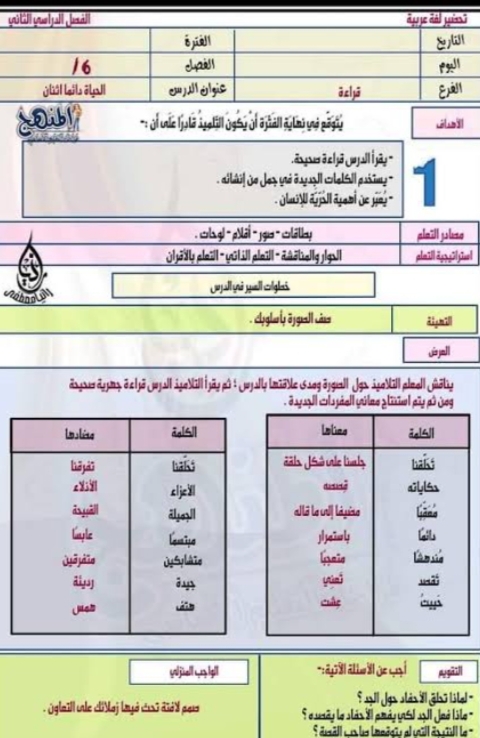 دفتر تحضير عربي للصف السادس الابتدائي