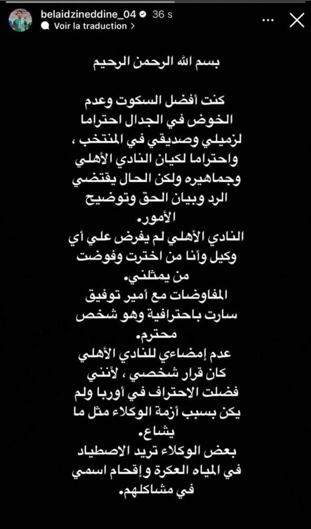 وأضاف: "الناس طلبت منه من أجل الدخول للأهلي أن يأتي مع (فلان مثلًا مع اكس) وهذا غير مقبول لدينا كجزائريين، أنا أقول الحقيقة ولا أخشى أحدًا، زين الدين بلعيد مع وكيله هذا من الصغر، ورفض أن يتخلى عنه من أجل المال".