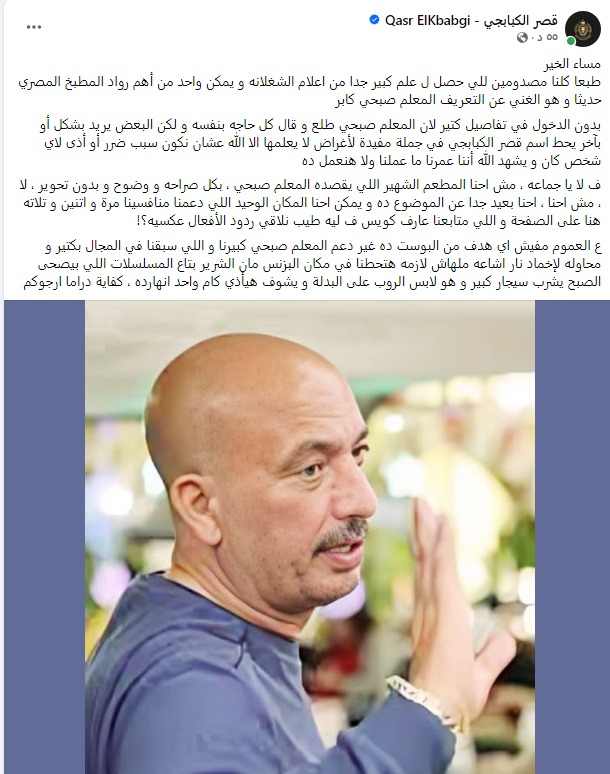 أعرب مطعم قصر الكبابجي في منشور له عبر صفحته الرسمية على موقع التواصل الاجتماعي “فيسبوك”، عن صدمته لما حدث للمعلم صبحي كابر، الذي يعتبر أحد أعلام المطبخ المصري الحديث وأحد الرواد المعروفين في هذا المجال.