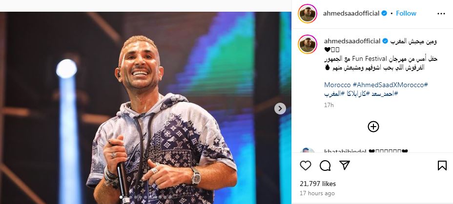 أحيا النجم أحمد سعد حفلة بالمغرب ضمن فعاليات مهرجان Fun Festival وأعرب عن سعادته بتوجية رسالة خاصة لشعب المغرب عبر صفحته الرسمية "إنستجرام".
