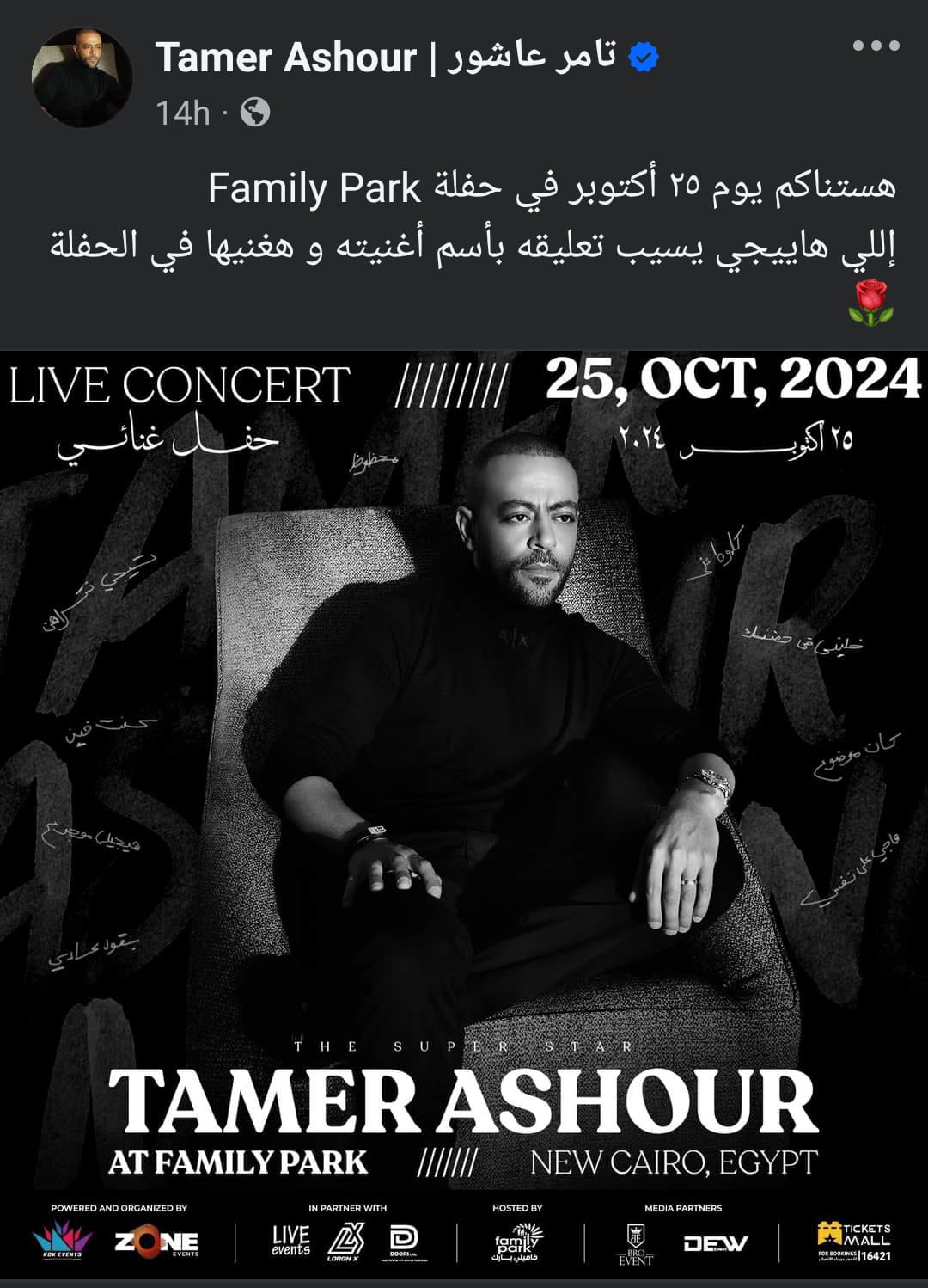 نشر تامر عاشور على صفحته الرسمية عبر موقع التواصل الاجتماعي "فيسبوك" وعلق قائلا : "هستناكم يوم 25 أكتوبر في حفلة فاميلي بارك، اللي هييجي يسيب تعليقه باسم أغنيته وهغنيها في الحفلة" .