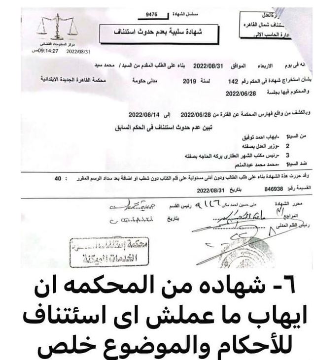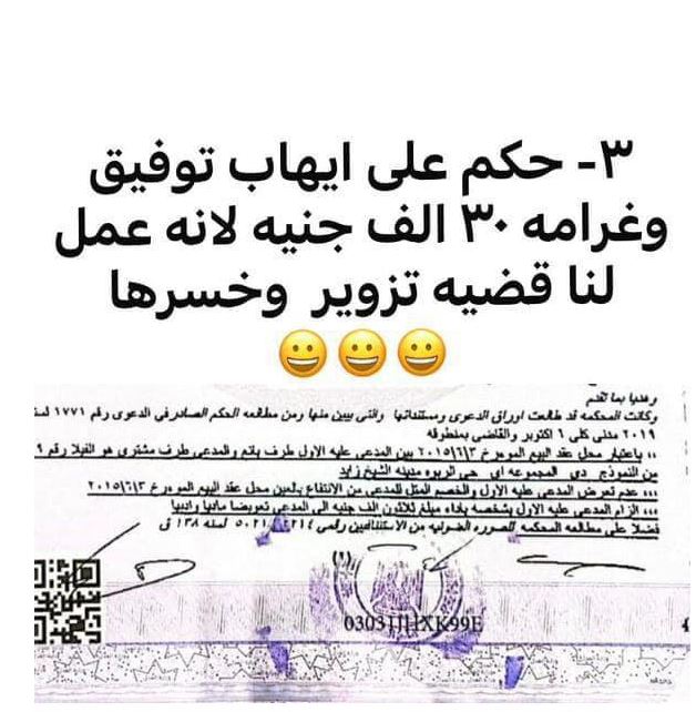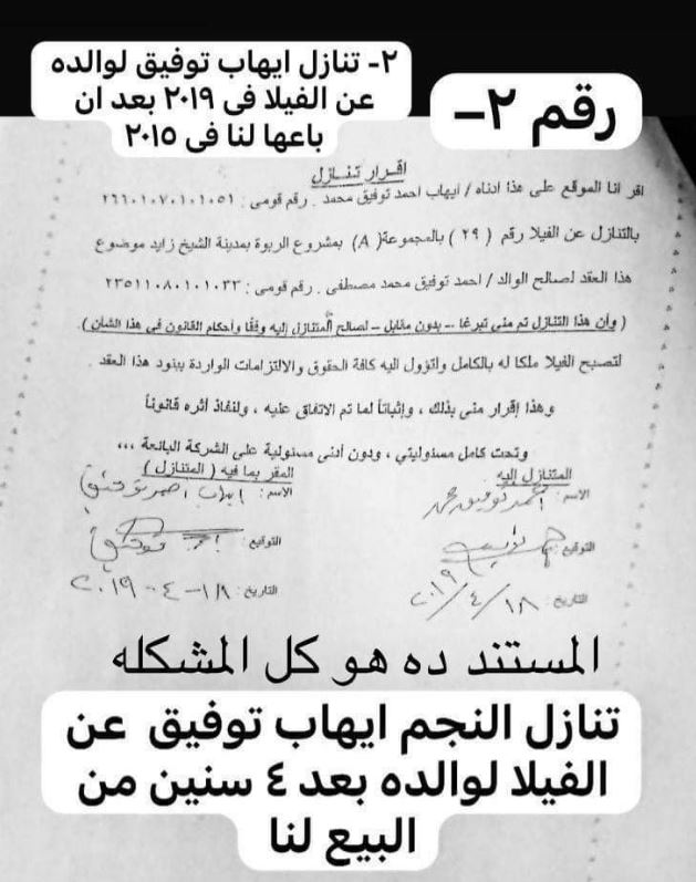 وارفقت الصفحة عدد من المستندات، ومنها توكيل بيع الفيلا من إيهاب توفيق عام ٢٠١٥، وذكرت: "استلمنا الفيلا واكتشفنا بعد سنه ان الرقم غلط فى العقد والتوكيل ، وعقد تنازل ايهاب عن نفس الفيلا لوالده الله يرحمه عام ٢٠١٩".