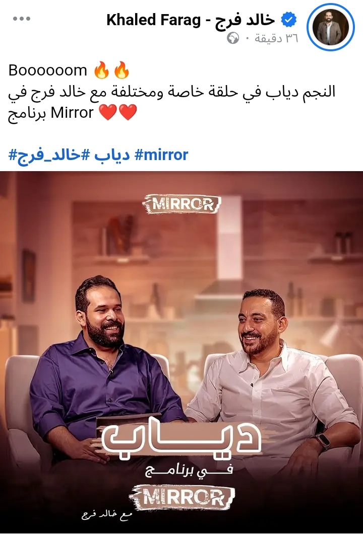 يحل الفنان محمد دياب، ضيفاً في برنامج «Mirror» مع الإعلامي خالد فرج، الذي يقدمه عبر منصة التواصل الاجتماعي «يوتيوب» ، ومن المتوقع أن يكشف محمد دياب خلال الحلقة العديد من الأسرار والتفاصيل المثيرة حول حياته الفنية والشخصية.