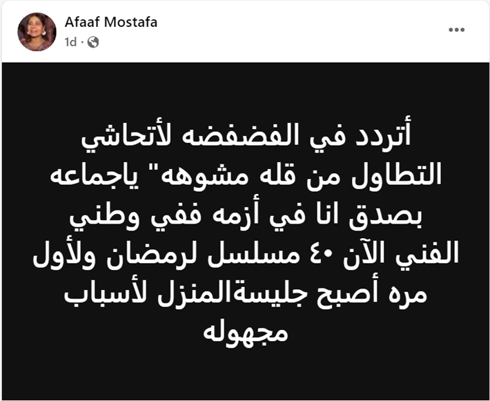 وخرجت عفاف مصطفى عن صمتها تستغيث من قلة العمل عبر حسابها الرسمي بموقع التواصل الاجتماعي، قائلة؛ أنها قبل كتابة هذا المنشور، ترددت كثيرا، خوفا من التطاول عليها من قبل مستخدمي مواقع التواصل الاجتماعي، مردفة: "أتردد في الفضفضه لأتحاشي التطاول من قله مشوهه ياجماعه بصدق انا في أزمه ففي وطني الفني الآن 40 مسلسل لرمضان ولأول مره أصبح جليسة المنزل لأسباب مجهوله".