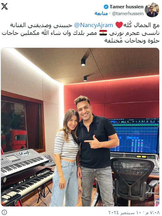 وشارك تامر حسين، صورة تجمعه بـ نانسي عجرم، عبر صفحته الرسمية على موقع التواصل الاجتماعي «إكس» وعلق عليها: «مع الجمال كُله، حبيبتي وصديقتي الفنانة نانسي عجرم نورتي، مصر بلدك وان شاء الله مكملين حاجات حلوة ونجاحات مُختلفة ».