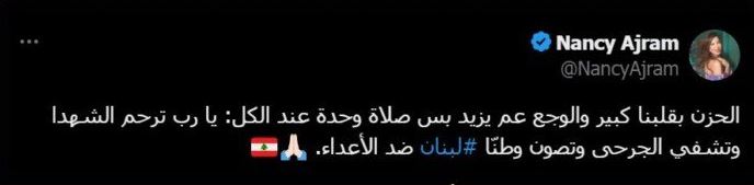 ونشرت نانسي عجرم، عبر حسابها بموقع التغريدات القصيرة إكس: «الحزن بقلبنا كبير والوجع عم بيزيد بس صلاة وحدة عند الكل، يا رب ترحم الشهداء وتشفي الجرحى وتصون وطنّا لبنان ضد الأعداء
