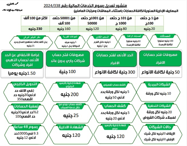 كشفت الهيئة القومية للبريد عن تعديل رسوم الخدمات المالية رقم 338 / 2024، مشيرة إلى أن المصاريف الإدارية السنوية تسري على كافة الحسابات باستثناء المعاشات ومرتبات العاملين.
