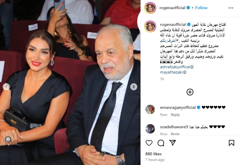 ونشرت روجينا صور تجمعها بزوجها الدكتور أشرف زكي، وصور مع ابنتهما مريم، وعلقت قائلة: "مبروك للنقابة ولمجلس الإدارة، مبروك فناني مصر دورة قوية إن شاء الله برئاسة النقيب أشرف زكي".