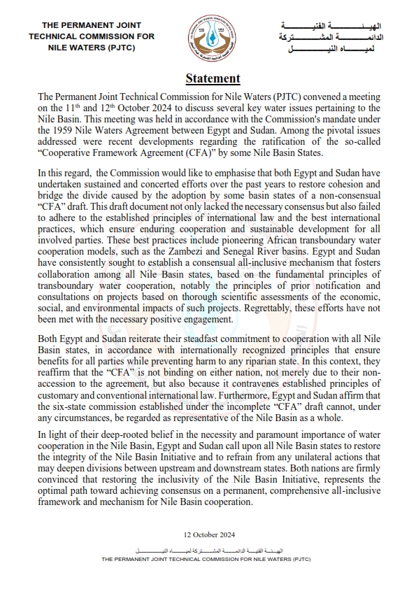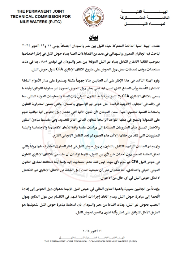 عقدت الهيئة الفنية الدائمة المشتركة لمياه النيل بين مصر والسودان اجتماعاً يومي 11 و12 أكتوبر 2024 تباحث فيه الجانبان المصري والسوداني في عدد من القضايا ذات الصلة بمياه حوض النيل في إطار اختصاصها بموجب اتفاقية الانتفاع الكامل بمياه نهر النيل الموقعة بين مصر والسودان في نوفمبر ١٩٥٩، بما في ذلك مستجدات موقف تصديقات بعض دول الحوض على مشروع الاتفاق الإطاري CFA لدول حوض النيل.