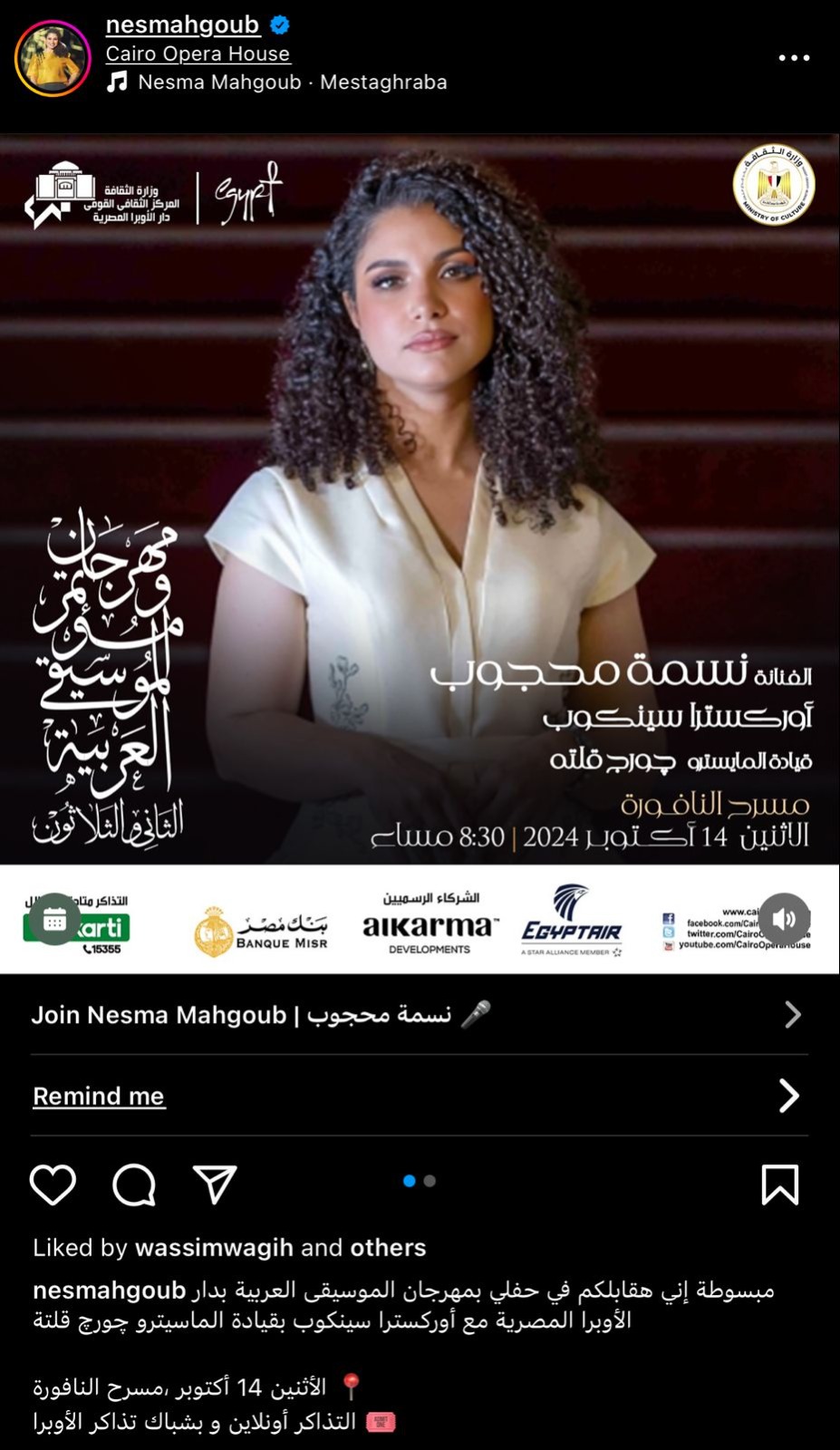 نشرت نسمة محجوب صورة بوستر الحفل على صفحتها الرسمية عبر موقع تبادل الصور والفيديوهات "إنستجرام" وعلقت قائلة : "مبسوطة إني هقابلكم في حفلي بمهرجان الموسيقى العربية بدار الأوبرا المصرية مع أوركسترا سينكوب بقيادة المايسترو جورج قلتة" .