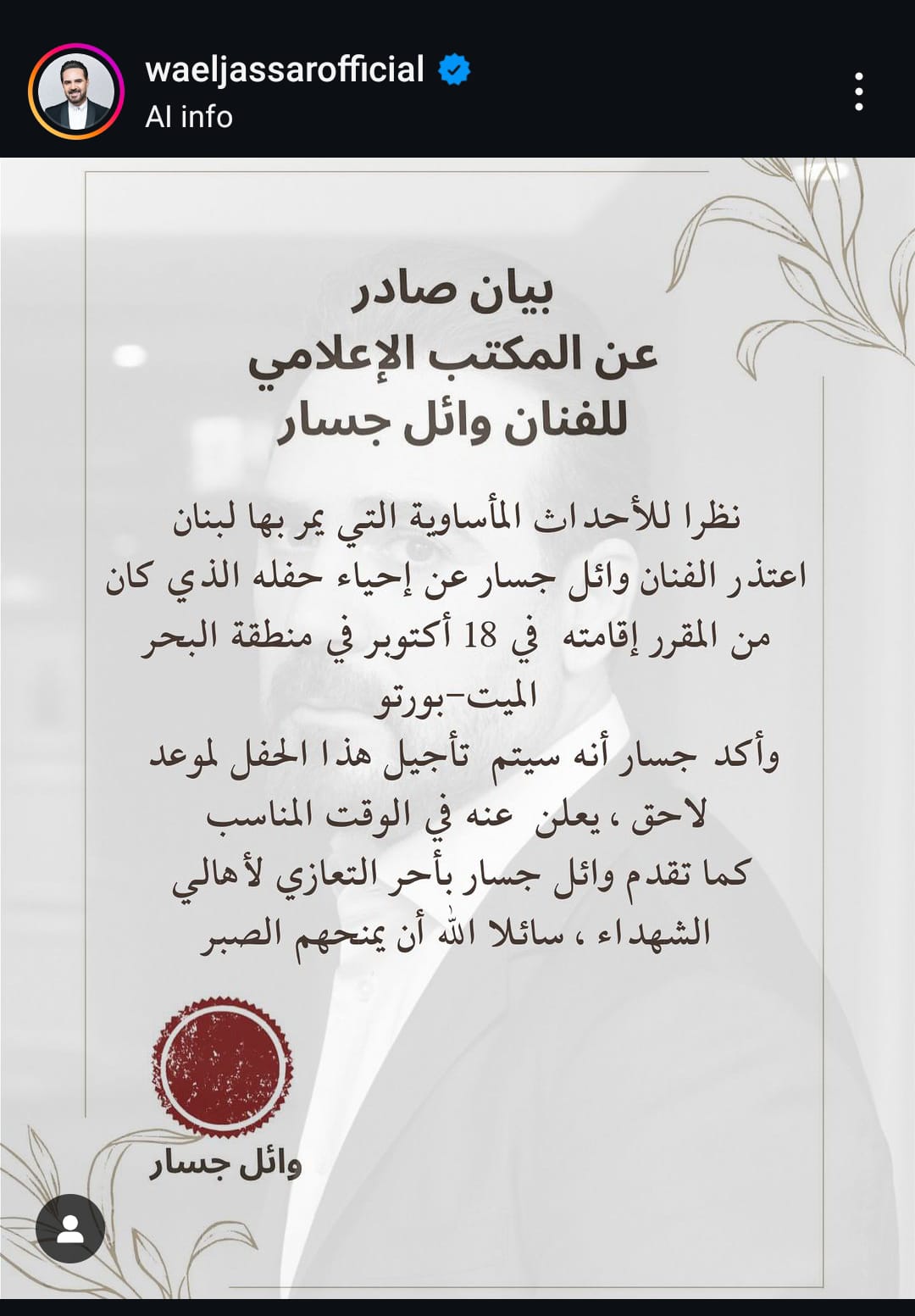 نشر وائل جسار بيان على صفحته الرسمية عبر موقع تبادل الصور والفيديوهات "إنستجرام" معلنا عن تأجيل الحفل لوقت لاحق وسيعلن عن الموعد الجديد للحفل في الوقت المناسب .