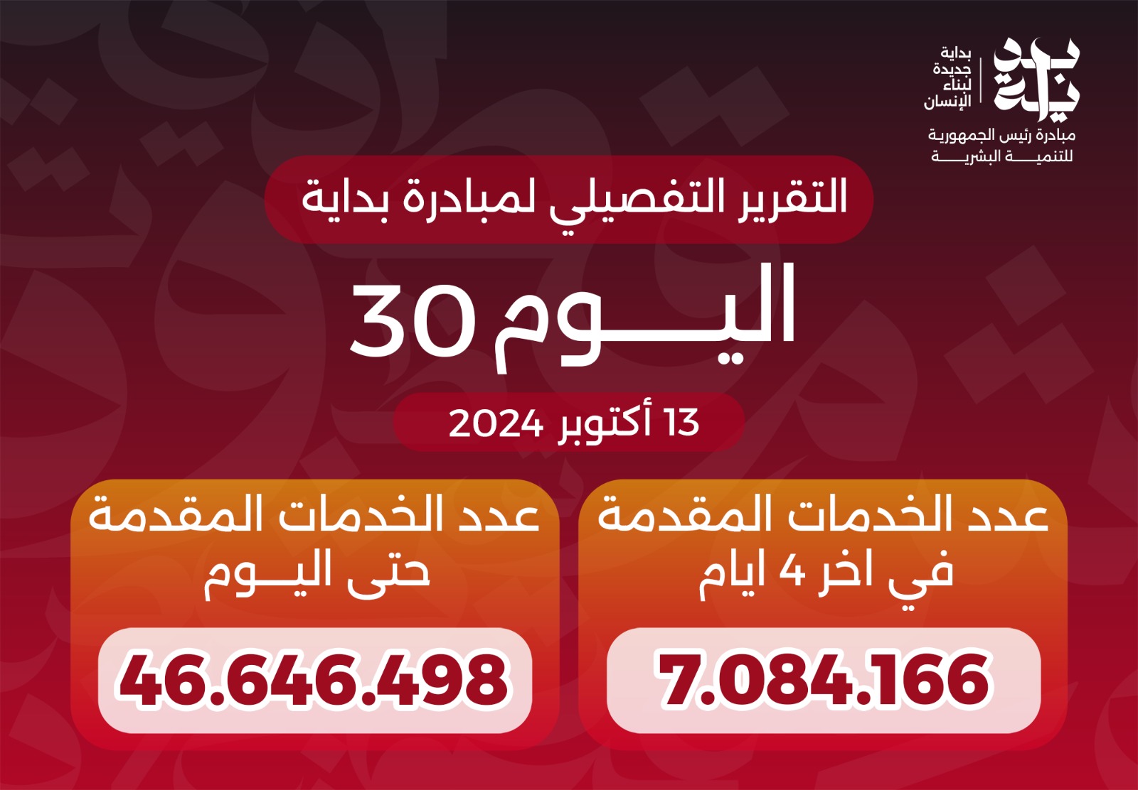 ونفذت «بداية» حملات طرق الأبواب للتوعية عن مخاطر الإدمان والتعاطي لـ20 ألفاً و504 شباب وشابات، وتقديم خدمات تأهيلية، وعلاجية وأجهزة تعويضية لـ 7 آلاف و959 مواطنا من ذوي الاحتياجات الخاصة، علاوة على تقديم 8 ملايين و824 ألف خدمة صحية، من خلال 55 قافلة طبية، تشمل خدمات علاجية ووقائية وتنظيم الأسرة، وزيارات منزلية، وزيارات متابعة الحمل، ونمو الطفل.