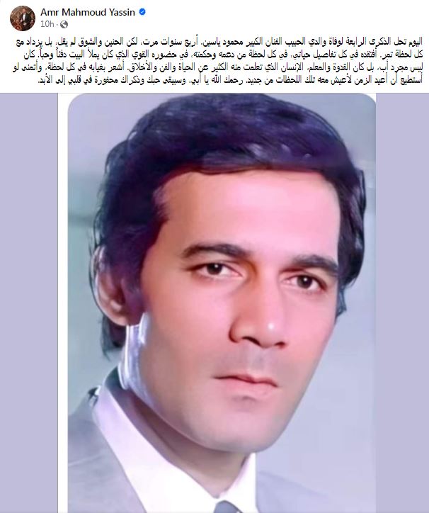 وأحيا عمرو ياسين ذكرى وفاة والده النجم محمود ياسين عبر صفحته الرسمية "فيس بوك" قائلا "اليوم تحل الذكرى الرابعة لوفاة والدي الحبيب الفنان الكبير محمود ياسين. أربع سنوات مرت، لكن الحنين والشوق لم يقل، بل يزداد مع كل لحظة تمر. أفتقده في كل تفاصيل حياتي، في كل لحظة من دعمه وحكمته، في حضوره القوي الذي كان يملأ البيت دفئاً وحباً.