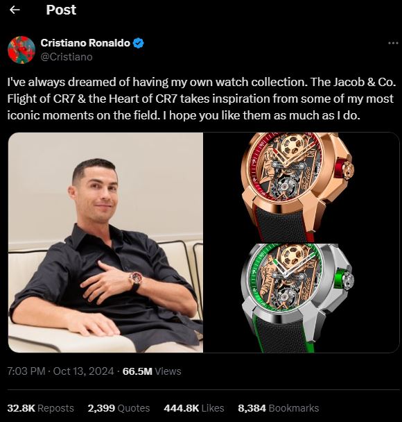 وشارك كريستيانو عبر حسابه الشخصي على منصة" إكس" ، صورة له وهو يرتدي إحدى الساعات في يده، بالإضافة إلى صور للساعتين بلونين مختلفين من دار جاكوب اند كو.