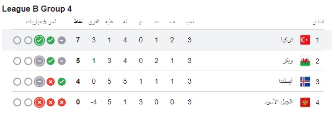 ويحتل منتخب تركيا المركز الأول في صدارة ترتيب المجموعة برصيد 7 نقاط من 3 مباريات.