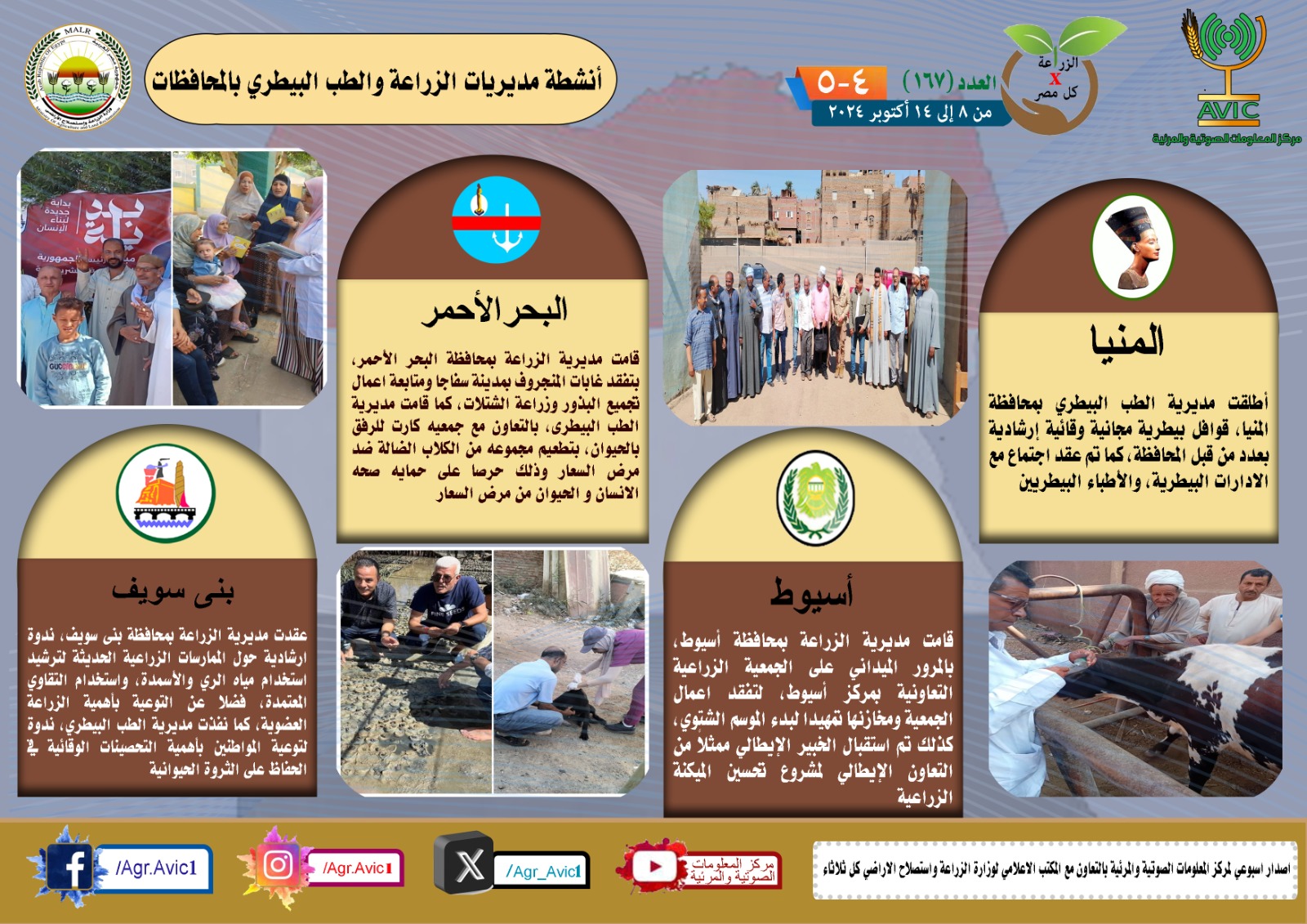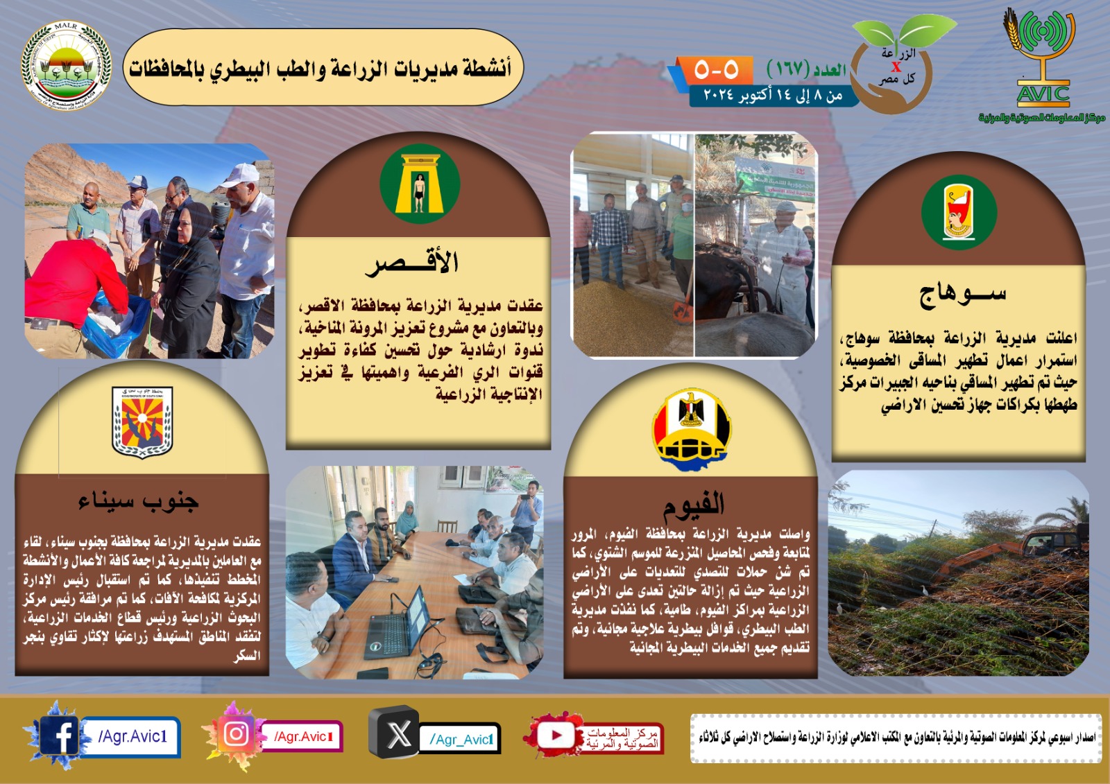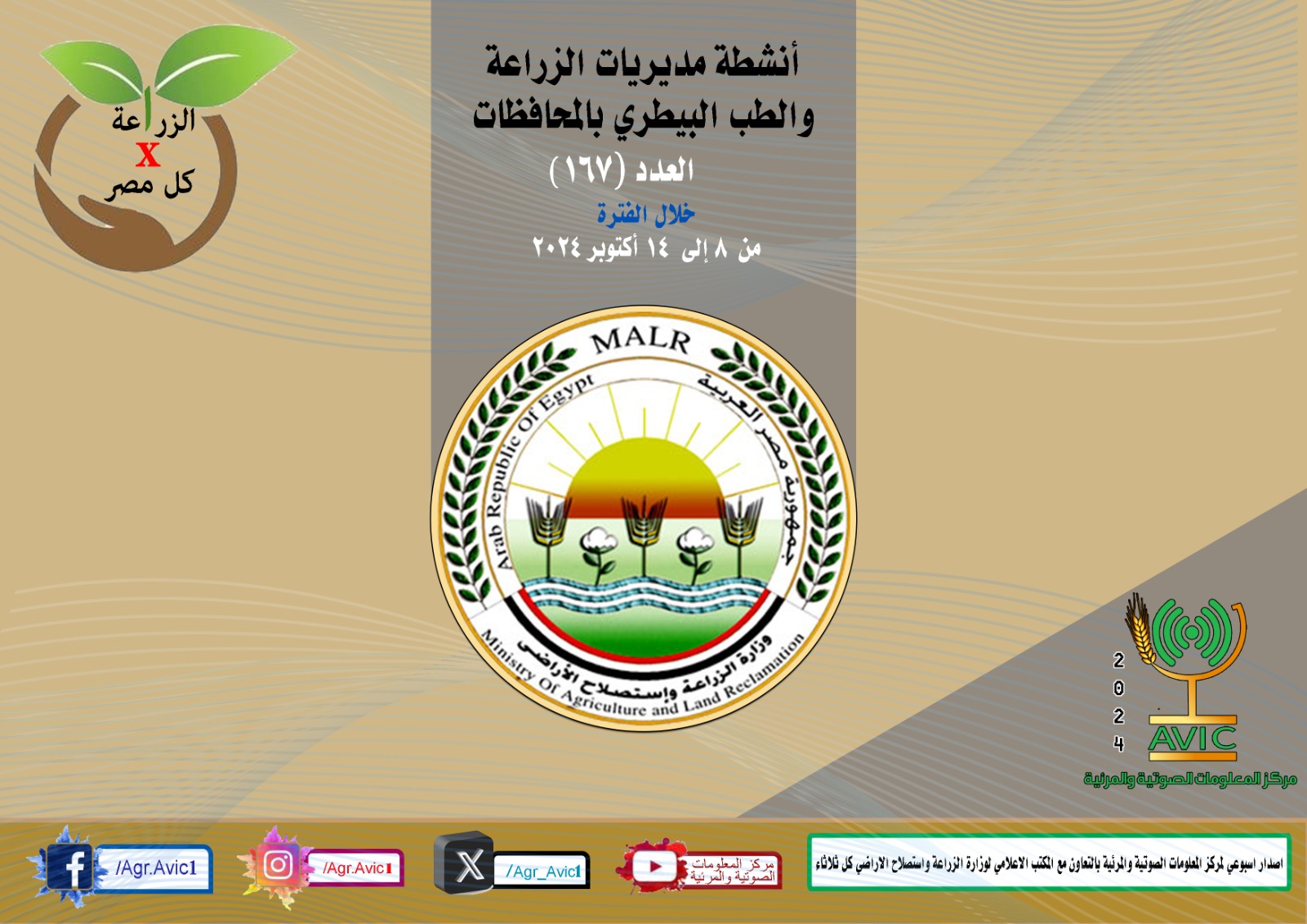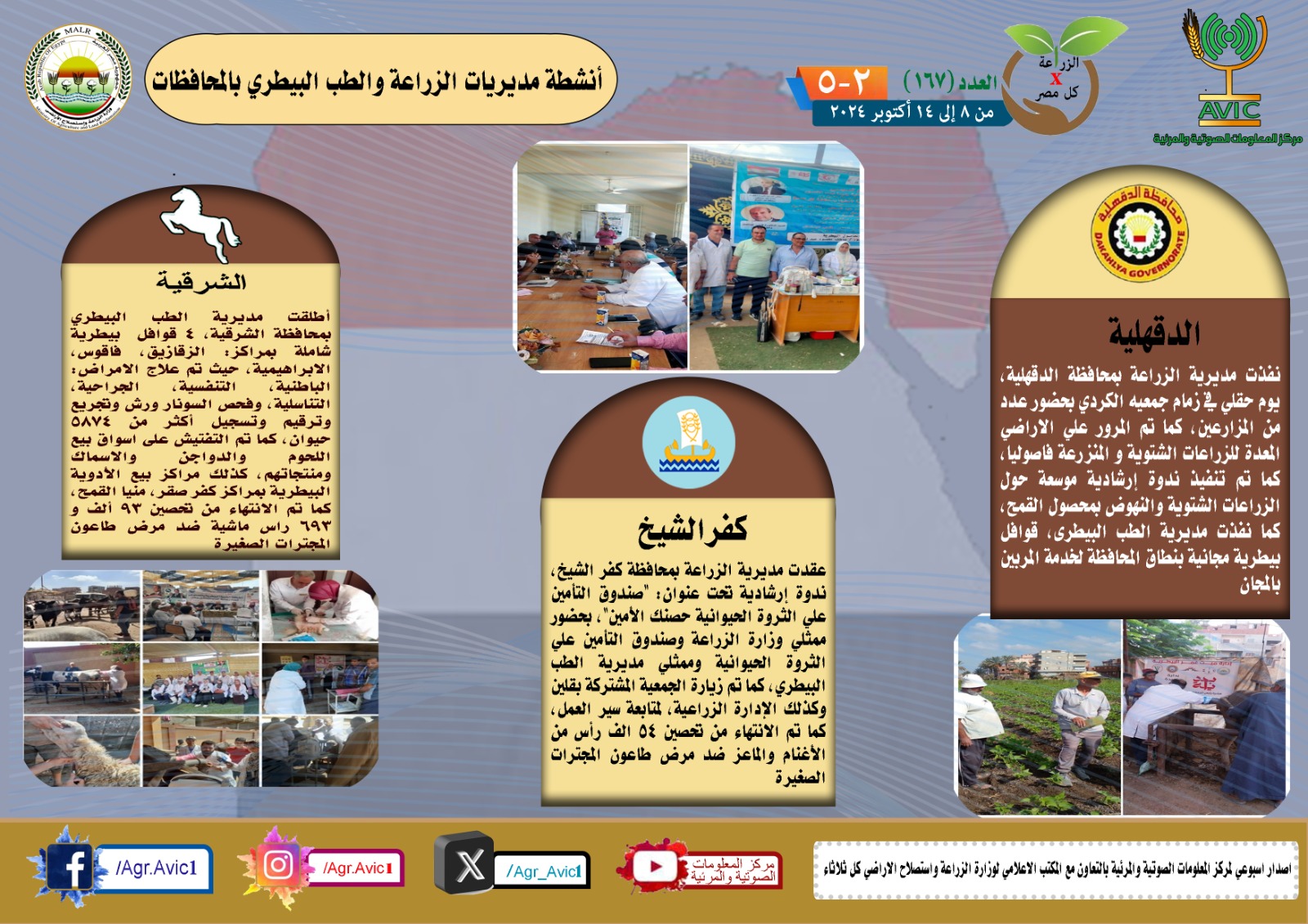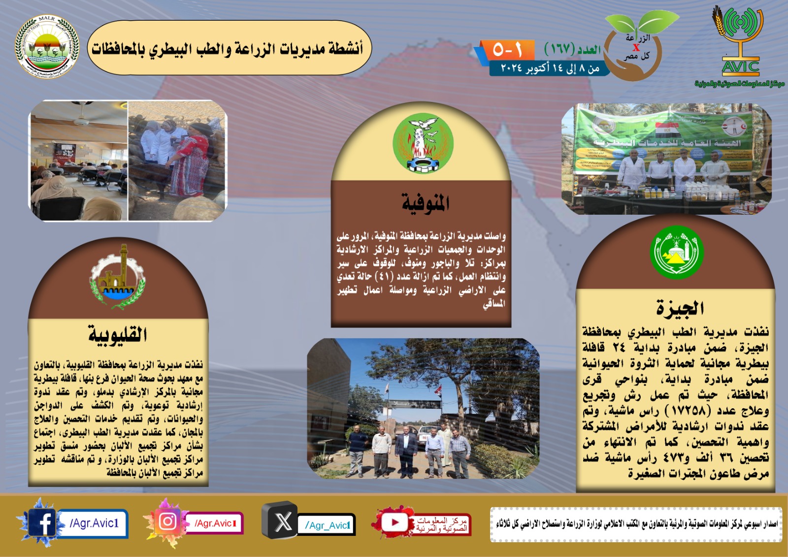 أصدر مركز المعلومات الصوتية والمرئية التابع لوزارة الزراعة واستصلاح الأراضي، والمكتب الاعلامي للوزارة، العدد رقم ١٦٧ من اصدار: "الزراعة في كل مصر" بالانفوجراف والفيديو، يوضح الجهود والانشطة التي تقوم بها مديريات الزراعة والطب البيطري بمحافظات الجمهورية خلال الفترة من ٨ وحتى ١٤ اكتوبر الجاري.