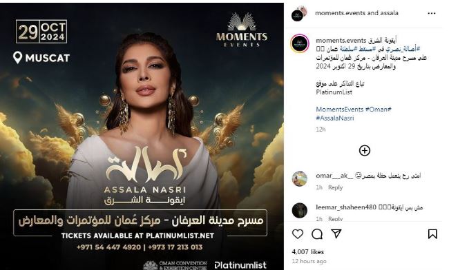 في سياق منفصل؛ تحيي النجمة أصالة يوم 29 أكتوبر حفل غنائي كبير على مسرح مدينة العرفان بسلطنة عمان بـ مركز عمان للمؤتمرات والمعارض.