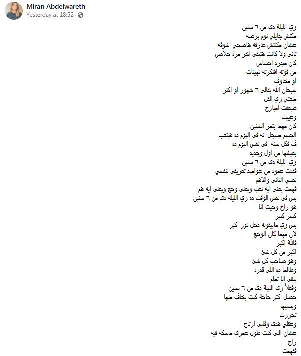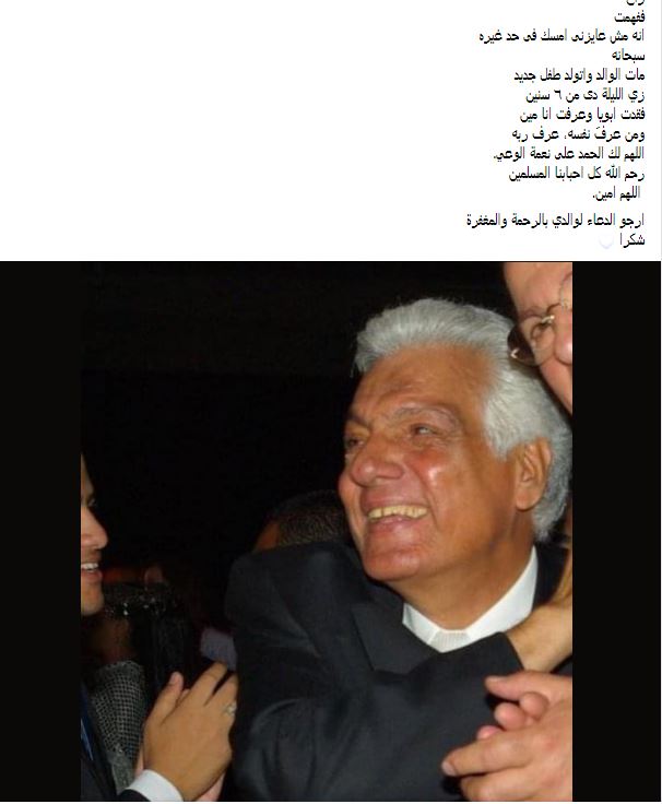 وأضافت: "زي الليلة دى من ٦ سنين، فقدت عمود من عواميد تعريفى لنفسي، نصي الثاني والأهم، فهمت يعنى ايه تعب ويعنى وجع، ويعنى ايه هم بس فى نفس الوقت ده زي الليلة دى من ٦ سنين، مات الوالد والولد طفل جديد، زي الليلة دي من ٦ سنين، فقدت ابويا وعرفت انا مين، ومن عرفَ نفسه، عرف ربه، اللهم لك الحمد على نعمة الوعي. رحم الله كل احبابنا المسلمين، ارجو الدعاء لوالدي بالرحمة والمغفرة ".