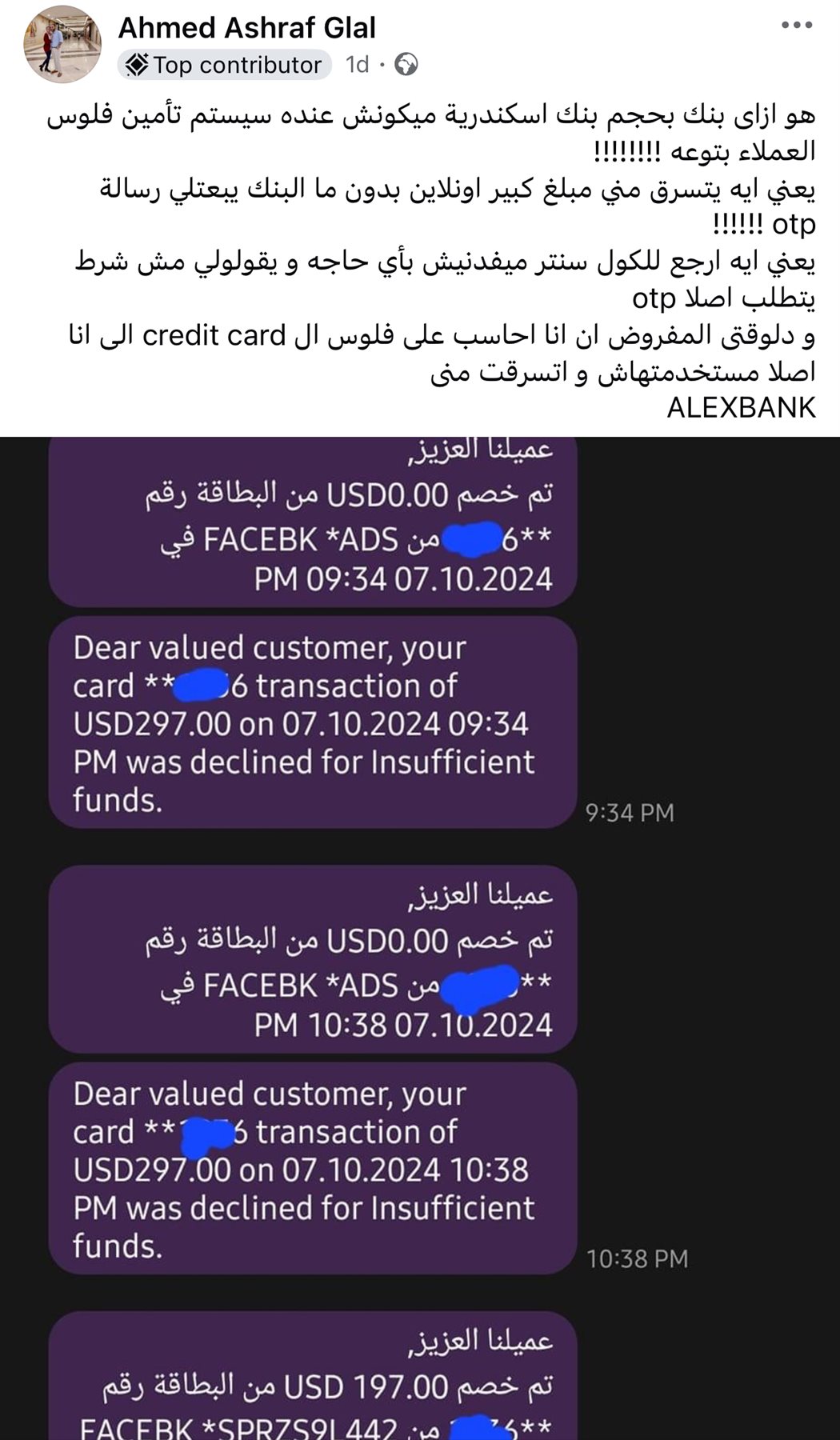 وقال صاحب الشكوى من خلال نشرها عبر الفيس بوك، "هو ازاى بنك بحجم بنك اسكندرية ميكونش عنده سيستم تأمين فلوس العملاء بتوعه !!!!!!!!يعني ايه يتسرق مني مبلغ كبير اونلاين بدون ما البنك يبعتلي رسالة otp !!!!!!يعني ايه ارجع للكول سنتر ميفدنيش بأي حاجه و يقولولي مش شرط يتطلب اصلا otp ".