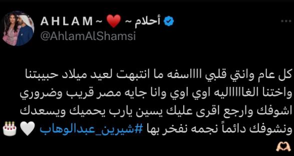 اعتذرت الفنانة أحلام الشامسي للنجمة شيرين عبد الوهاب عبر صفحتها الرسمية بمنصة "أكس" لعدم تهنئتها بعيد ميلادها".