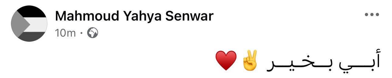 فى الوقت الذى أعلنت فيه إسرائيل اغتيال يحيى السنوار، زعيم حركة حماس ، خرج صفحة منسوبة لنجل زعيم الحركة، ليكذب الجيش الإسرائيلي عبر منشور على موقع التواصل الاجتماعى، كتب خلاله: "أبى بخير"، ولم يتثنى لنا التأكد من صاحب الصفحة سواء كانت ملكًا لنجل السنوار أم هي منسوبة له.