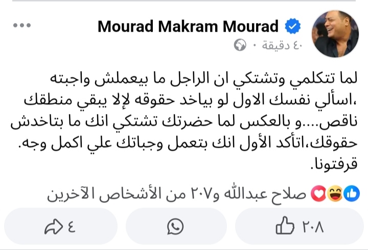 وجه الفنان مراد مكرم رسالة لجمهوره، انتقد فيها السيدات ووجه نصيحة للرجال، عبر حسابه الشخصي بموقع التواصل الاجتماعي "فيس بوك".