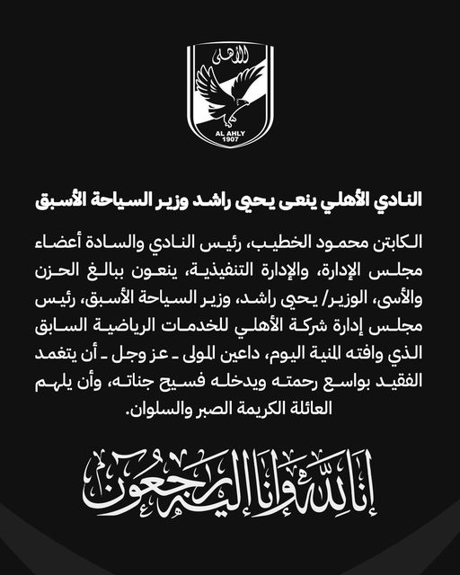 نعى رئيس النادي الأهلي، الكابتن محمود الخطيب، رئيس النادي، أعضاء مجلس الإدارة، والإدارة التنفيذية، الوزير يحيى راشد، وزير السياحة الأسبق.
