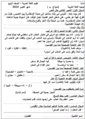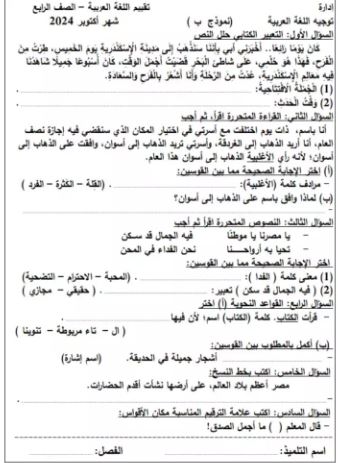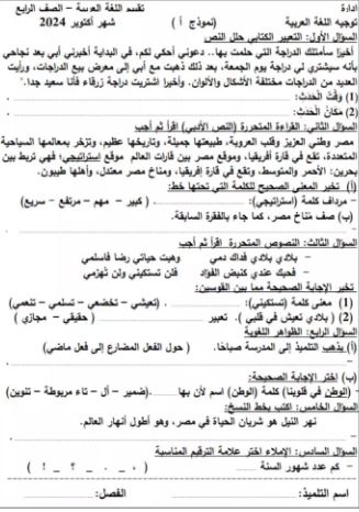 امتحان شهر أكتوبر للصف الرابع الابتدائي لغة عربية 2024
