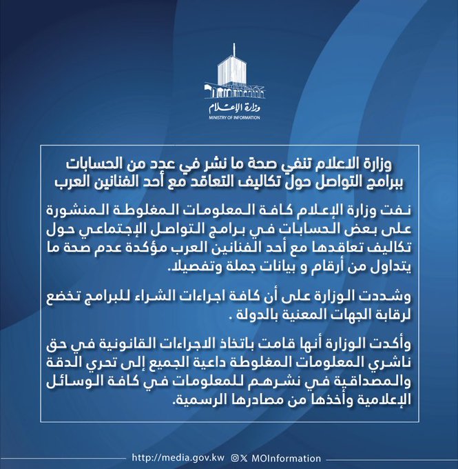 أصدرت وزارة الإعلام الكويتيه بيان رسمي عبر حسابها الرسمي علي موقع إكس ونفت فيه حقيقة ما نشر عبر برامج التواصل الإجتماعي من التعاقد مع أحد الفنانين العرب وذلك دون أن تذكر أسم الفنان بيومي فؤاد، وأكدت أنها قامت بإتخاذ إجراءات قانونيه في حق كل من ينشر المعلومات الخاطئه والمغلوطه وطالبت بالتأكد من صحة ودقة المعلومات قبل نشرها علي وسائل التواصل الإجتماعي.