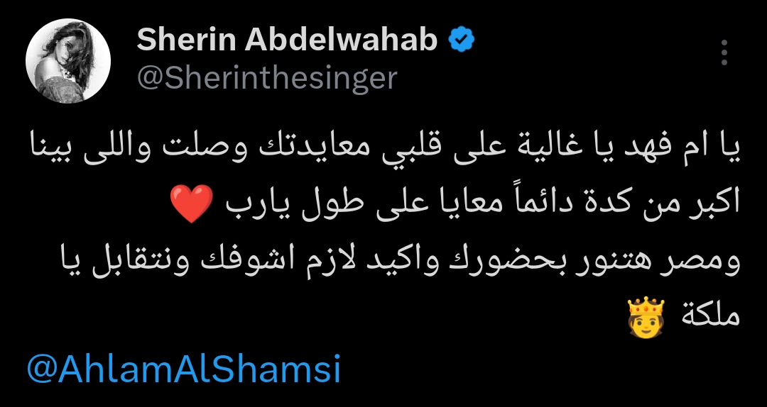 كتبت شيرين تغريدة على صفحتها الرسمية عبر منصة "إكس" وعلقت قائلة : "يا أم فهد يا غالية على قلبي معايدتك وصلت واللي بيننا أكبر من كدة دايما معايا على طول يارب" .