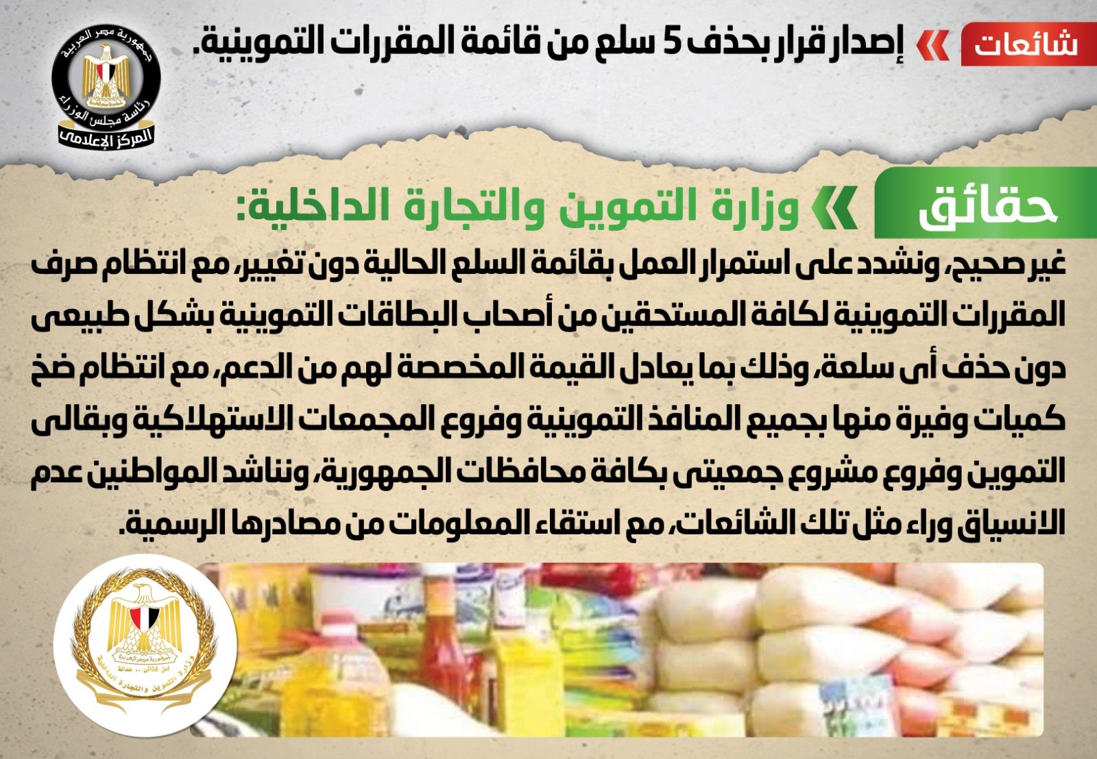 تداولت بعض صفحات التواصل الاجتماعي أنباء بشأن إصدار قرار بحذف 5 سلع من قائمة المقررات التموينية.