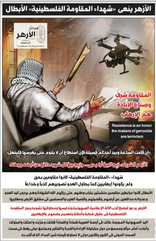 وفي وقت سابق نعى الأزهر الشريف "شهداء المقاومة الفلسطينية الأبطال"، رافضا نعتهم بالإرهابيين، وذلك بعد ساعات من إعلان الجيش الإسرائيلي يوم الخميس الماضي مقتل رئيس المكتب السياسي لحركة حماس يحيى السنوار.
