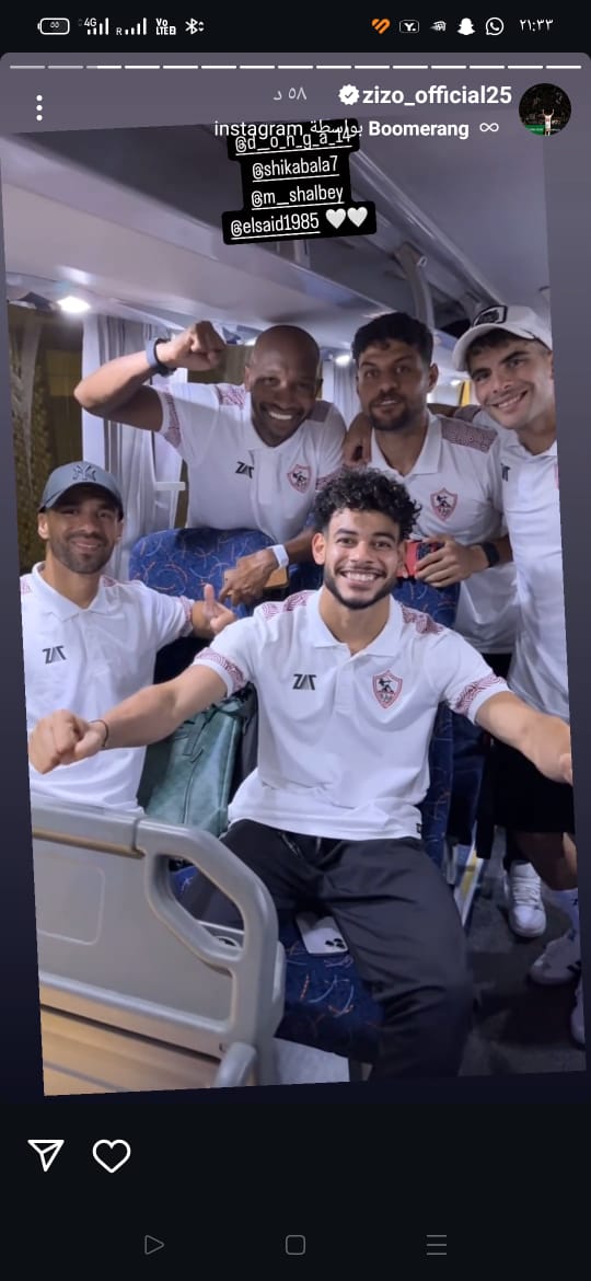 قام أحمد السيد زيزو، لاعب نادي الزمالك، بنشر ستوري على حسابه الرسمي على إنستجرام يظهر فيه مع زملائه في حافلة الفريق، بما في ذلك نبيل دونجا وعبد الله السعيد وشيكابالا ومصطفى شلبي.