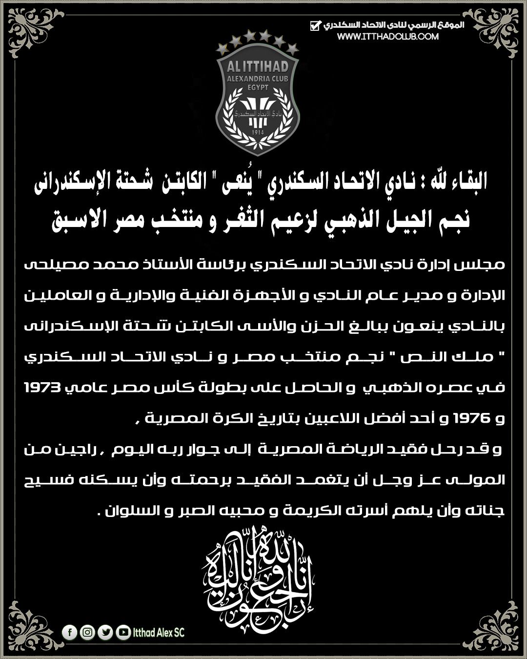 كمل نعى مجلس إدارة نادى الاتحاد السكندرى، برئاسة محمد مصيلحى، رئيس النادى ، باسم المجلس والجماهير وأعضاء النادى الكابتن شحتة الاسكندرانى، والذي خلف وراءه ارث كبير من الانجازات والبطولات لصالح سيد البلد طيلة فترة تواجده فى النادى.
