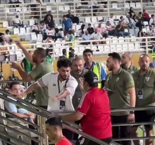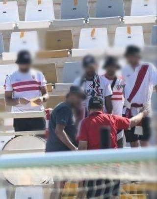 كشفت الصور المنتشرة علي وسائل التواصل الإجتماعي، عن قيام صاحب التيشيرت الأحمر باستفزاز لاعب الزمالك" دونجا" ، فضلا عن قيام صاحب التيشيرت بإشارة غير أخلاقية بيديه، وهو ما أثار غضب اللاعبين وأدى لقيام " مصطفى شلبي" بالمشاجرة معه.