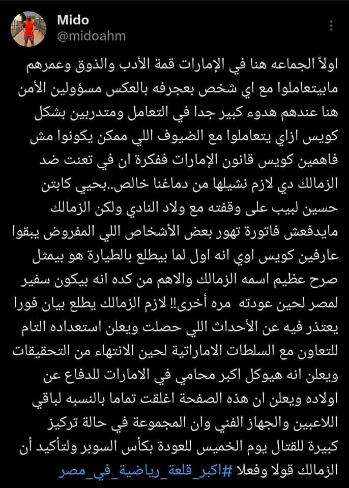 وشدد ميدو على أن نادي الزمالك بحاجة ماسة إلى إصدار بيان اعتذار رسمي عن الأحداث التي وقعت، مع تأكيد استعداد النادي الكامل للتعاون مع السلطات الإماراتية حتى انتهاء التحقيقات.