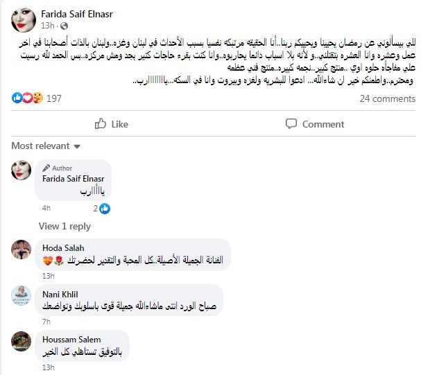 ونشرت فريدة سيف النصر منشور عبر صفحتها الرسمية "فيس بوك" ، قائلة: «اللي بيسألوني عن رمضان يحيينا ويحييكم ربنا، أنا الحقيقة مرتبكه نفسيا بسبب الأحداث في لبنان وغزة، ولبنان بالذات أصحابنا في أخر عمل وعشرة وأنا العشرة بتقتلني، ولأنه بلا أسباب دائما يحاربوه».