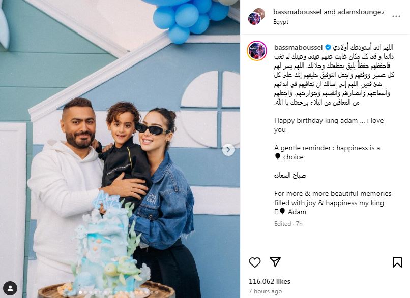 ونشرت بسمة بوسيل لقطات من احتفال عيد ميلاد نجلهما أدم، ، وعلقت عليها قائلة: «اللهم إني أستودعك أولادي دائما وفي كل مكان غابت عنهم عينى وعينك لم تغب فاحفظهم حفظاً يليق بعظمتك وجلالك ، اللهم يسر لهم كل عسير ووفقهم واجعل التوفيق حليفهم إنك على كل شيء قدير، اللهم إني أسألك أن تعافيهم في أبدانهم وأسماعهم وأبصارهم وأنفسهم وجوارحهم، واجعلهم من المعافين من البلاء برحمتك يا الله».