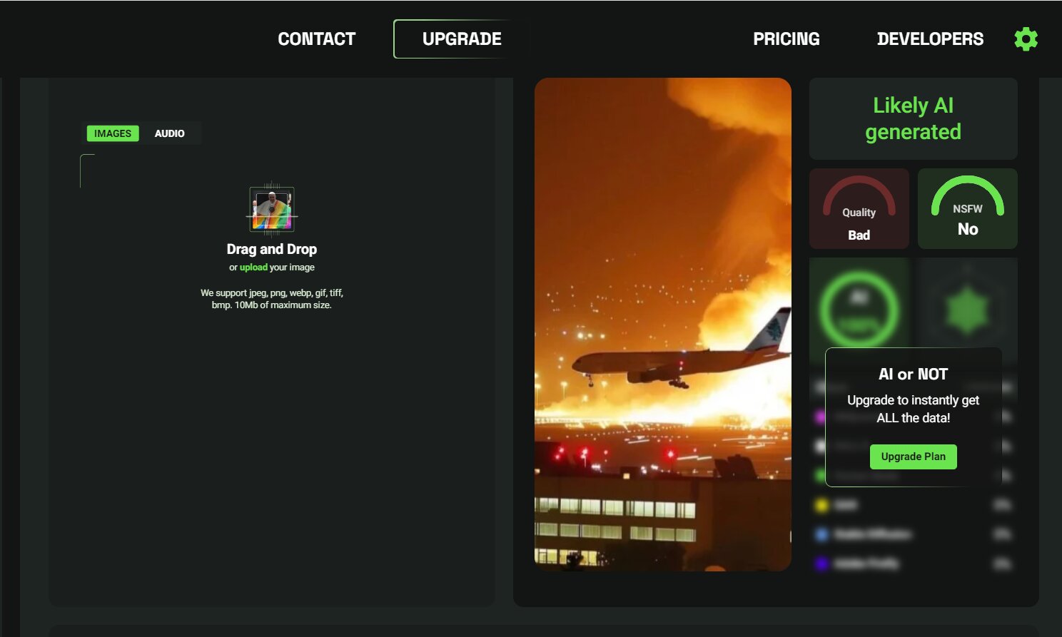 وحاول “مصر تايمز” التحقق من الصور المتداولة، حيث يظهر موقع “Ai or not” المتخصص في التحقق من الصور، إن الصورة المتداولة للطائرة الملامسة للنيران في سماء لبنان، صنعت بواسطة الذكاء الاصطناعي، وهذا ما يشير إلى عدم صحة الصور المتداولة.