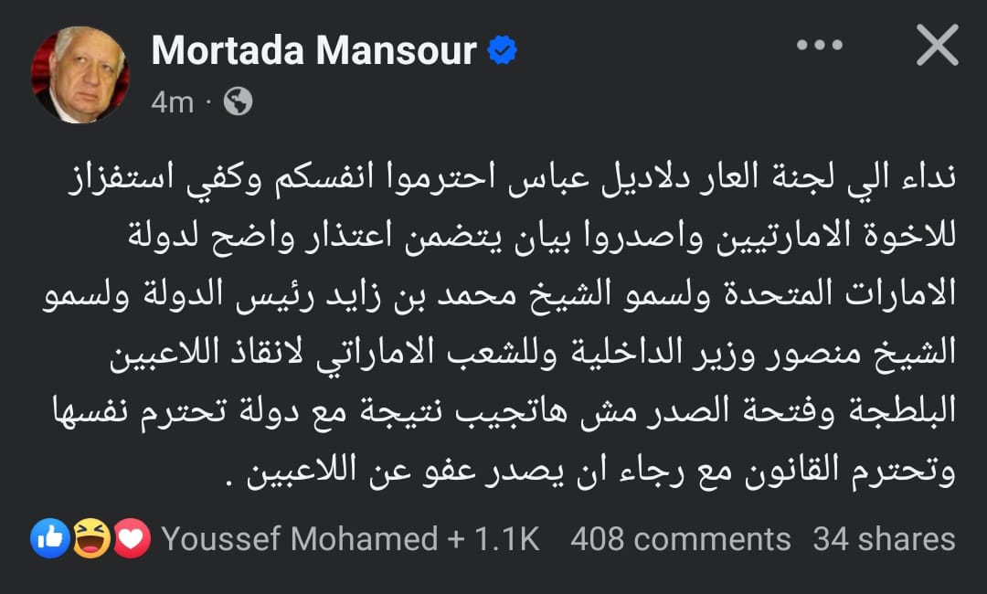 هاجم المستشار مرتضى منصور رئيس مجلس نادي الزمالك السابق، مجلس إدارة القلعة البيضاء، على حلفية أزمة الثلاثي قائلًا: "احترموا نفسكم واعتذروا للأخوة الإمارتيين".