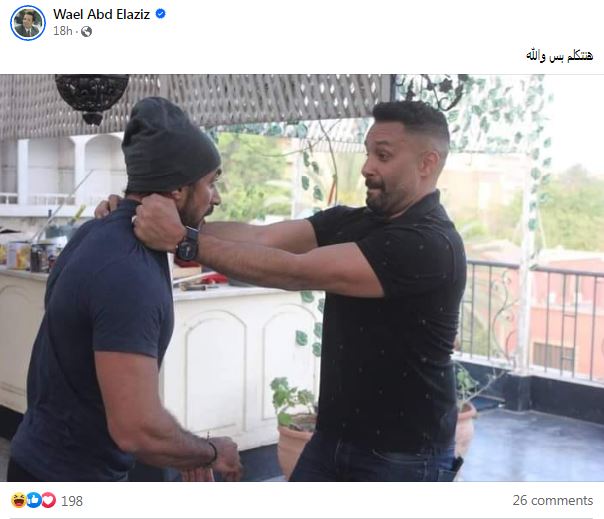 شارك وائل عبد العزيز شقيق النجمة ياسمين عبد العزيز صورة طريفة تجمعه بالفنان أحمد العوضي عبر صفحته الرسمية "فيس بوك" وعلق عليها " هنتكلم بس والله".