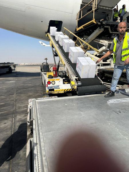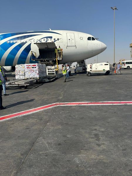 وأقلعت الرحلة رقم (1711 MS)، فى تمام الساعة (2.30 ظهراً)، من مطار القاهرة الدولي محملة بشحنة مساعدات إنسانية ومستلزمات طبية بلغ وزنها( 22 طن) مقدمة من جانب الهلال الأحمر و وزارة الصحة.
