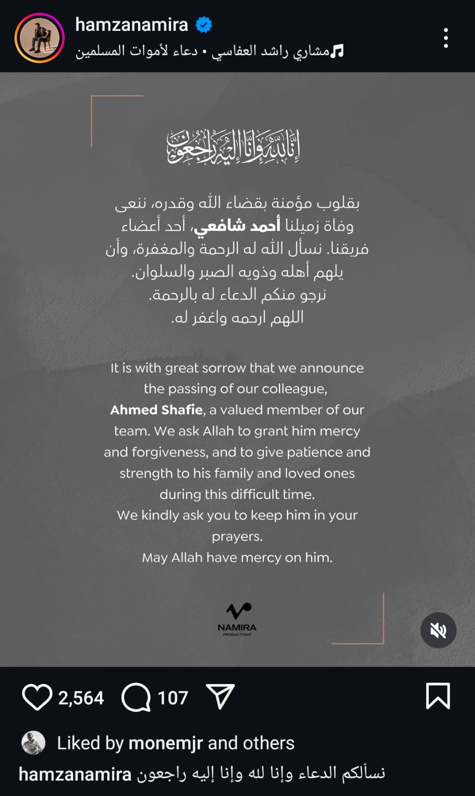 نشر حمزة نمرة بيان على صفحته الرسمية عبر موقع تبادل الصور والفيديوهات "إنستجرام" وعلق قائلا : "نسألكم الدعاء وإنا لله وإنا إليه راجعون" .