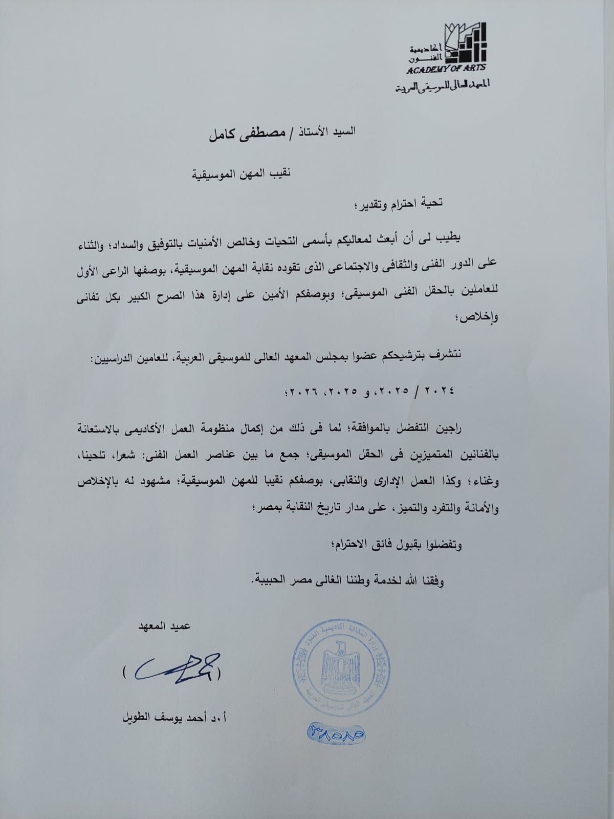 وأعلن مصطفى كامل نقيب الموسيقيين فى منشورا وقال : اللهم لك الحمد والشكر دائما وأبدا أسعدني وشرفني وزادني فخرًا اتصال تليفوني من أستاذ دكتور أحمد يوسف عميد المعهد العالي للموسيقي العربية والسادة قامات مصر الفنية أعضاء مجلس المعهد العالي لإبلاغي بخبر من أسعد الأخبار، ترشيحي وتكليفي عضوًا بالمجلس بالمعهد العالي للموسيقي العربية، وهذا شرف كبير لي انضمامي إلي مجلس الأساتذة الكبار الأكاديميين، شكرًا وحمدًا لله أولًا وأخيرًا.