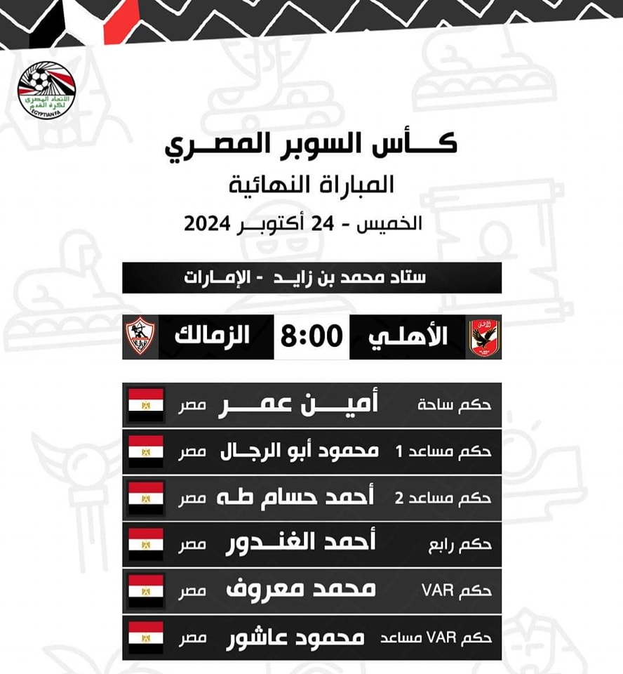 أعلنت اللجنة المنظمة لبطولة كأس السوبر المصرى عن طاقم تحكيم مباراة الزمالك والاهلى غداً فى نهائى كأس السوبر المصرى.