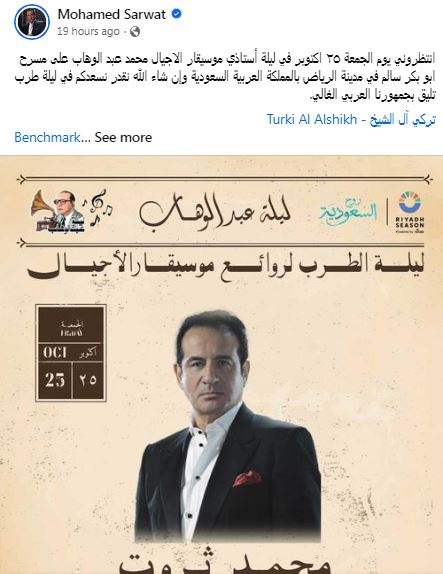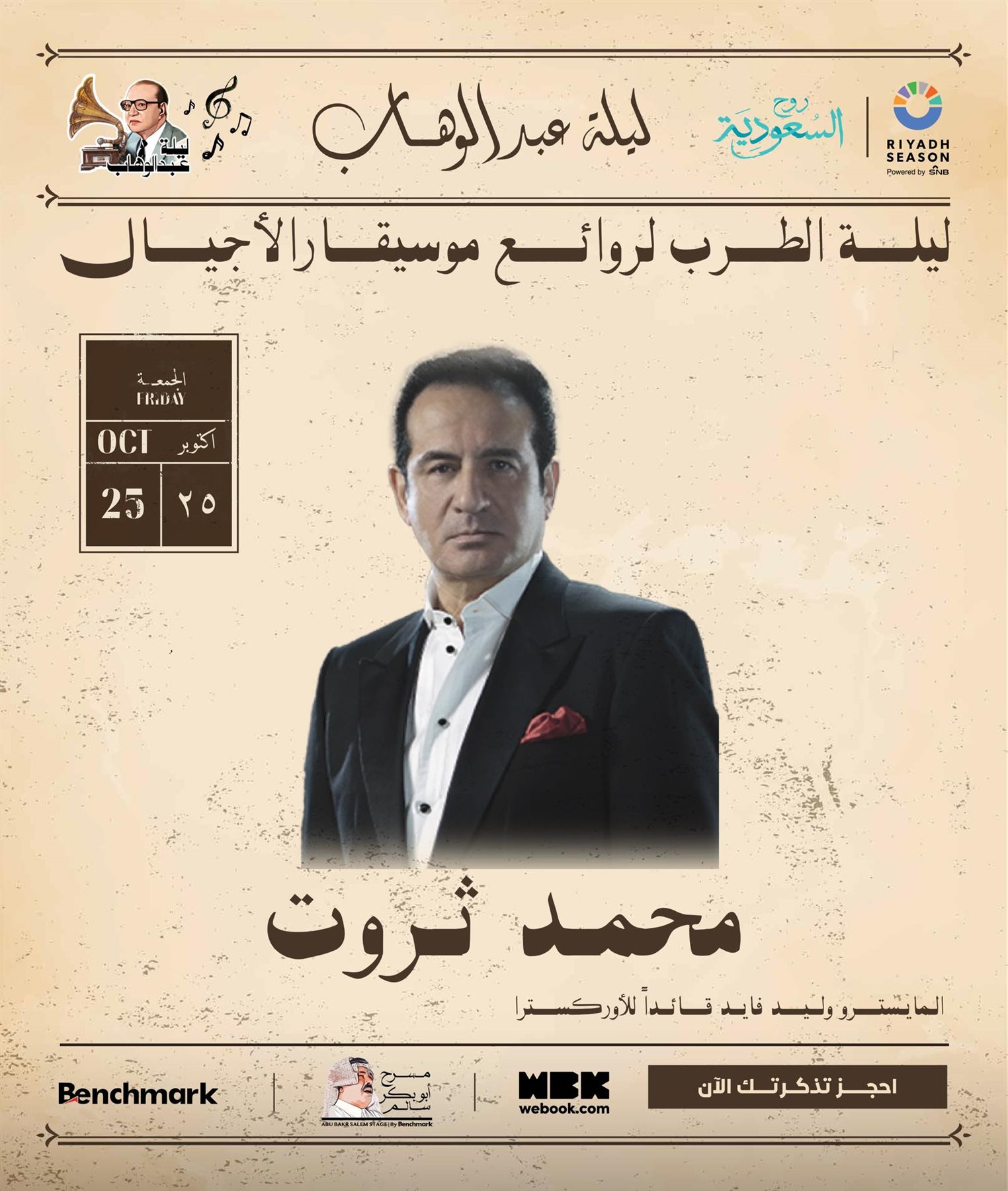 ونشر النجم محمد ثروت البوستر الدعائي للحفل عبر صفحته الرسمية وعلق " انتظروني يوم الجمعة ٢٥ اكتوبر في ليلة أستاذي موسيقار الأجيال محمد عبد الوهاب على مسرح ابو بكر سالم في مدينة الرياض بالمملكة العربية السعودية وإن شاء الله نقدر نسعدكم في ليلة طرب تليق جمهورنا العربي الغالي".