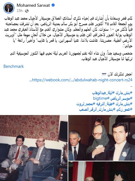 كما شارك محمد ثروت مجموعة من الصور التي تجمعه بموسيقار الاجيال محمد عبد الوهاب وعلق عليها " كلي فخر وسعادة بأن أشارك في إحياء ذكرى أستاذي العملاق موسيقار الأجيال محمد عبد الوهاب يوم الجمعة القادم ٢٥ أكتوبر على مسرح أبو بكر سالم بمدينة الرياض".