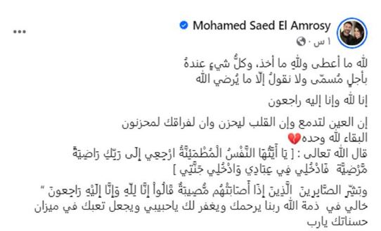 وكتب العمروسي: "لله ما أعطى وللهِ ما أخذ، وكلُّ شيءٍ عندهُ بأجلٍ مُسمّى ولا نقولُ إلّا ما يُرضي الله، إنا لله وإنا إليه راجعون، إن العين لتدمع وإن القلب ليحزن وإنا لفراقك لمحزنون، البقاء لله وحده".