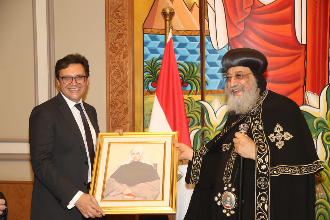 ورحب قداسة البابا بالوزيرين والوفد المرافق لهما، وحدّثهم عن الكنيسة القبطية الأرثوذكسية وتاريخها الممتد عبر ألفي سنة، ودورها الوطني طوال مسيرتها، مشيرًا إلى أن كتابة سيرة البطاركة الأقباط تقدم صورة متعددة الزوايا لتاريخ مصر.